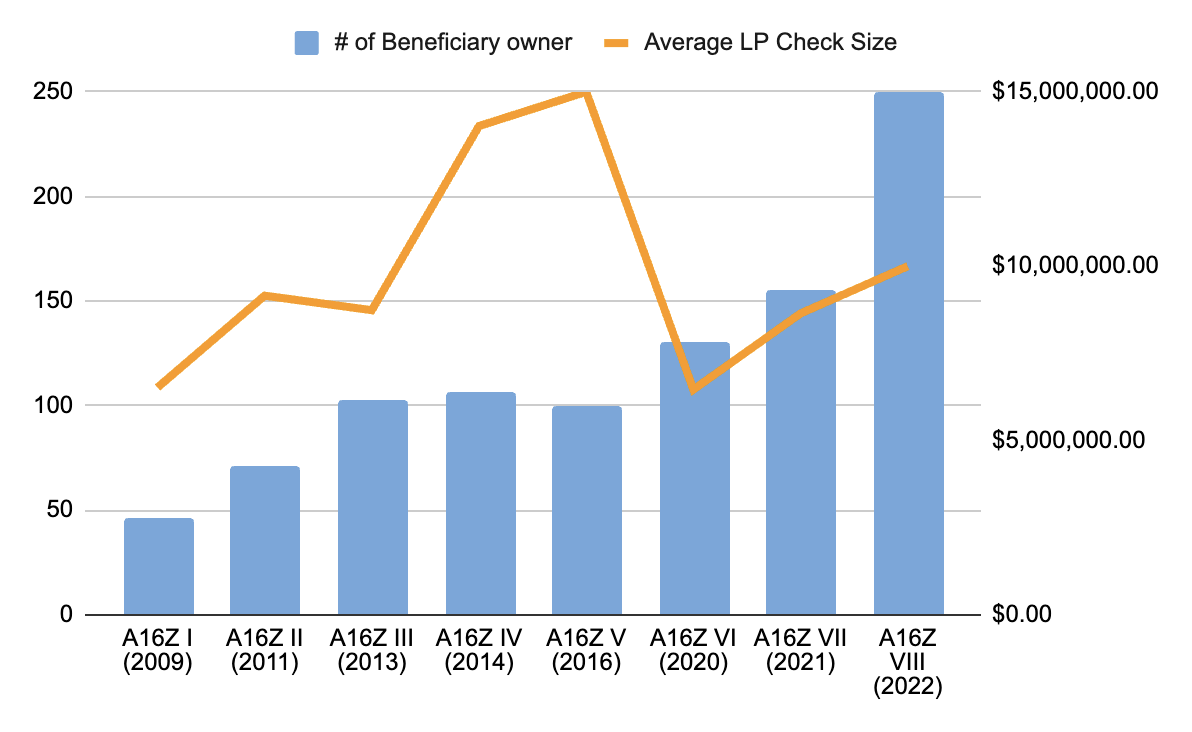 예로 앤드리센 호로위츠(Andreessen Horowitz)를 살펴보겠습니다. 아래 차트는 2009년 1호 펀드부터 2022년 8호 펀드까지 각 펀드의 LP 수와 평균 체크 사이즈를 나타냅니다. LP 수는 SEC 공개 자료를, 펀드 사이즈는 PitchBook 데이터를 활용했습니다.